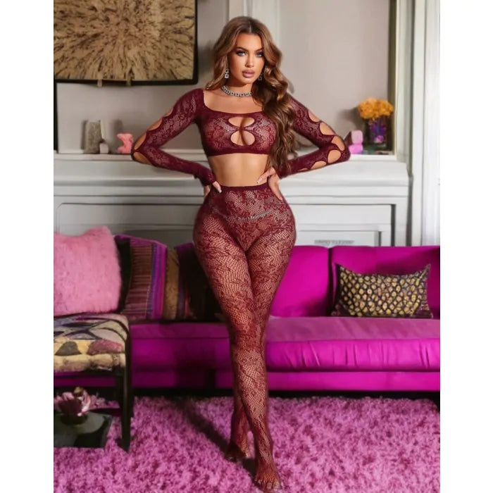 Top med strømpebukser S/L – Vinrød – Forførende sæt i ét